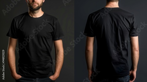 A man wears a plain black t-shirt, front and back, for a t-shirt design mock-up