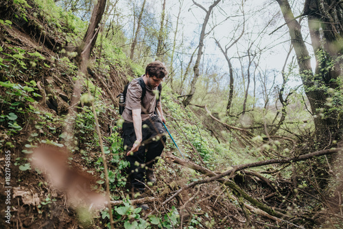 hiker, forest, trail, backpack, walking, branch, nature, outdoors, wood, adventure, exploration, moss, leaf, sunlight, tree, foliage, hillside, path, dirtied, earth, climb, rugged, forest floor, trekking, man, stick, balance, fitness, travel, scenery, environment, calm, peaceful, greener, discovery