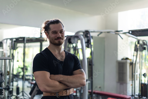 A man with a beard and a ponytail is posing for a picture in a gym. He is wearing a black shirt and a belt