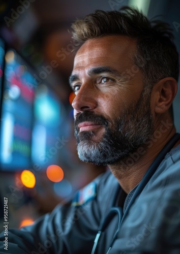 A man with a beard and glasses is looking at a computer screen