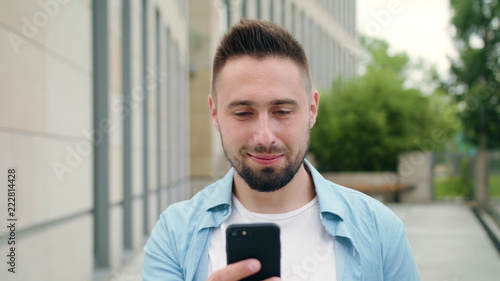 A man with a beard smiling and using a phone in the city street. Medium shot. Soft focus
