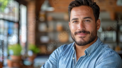 man, beard, blue shirt, facial hair, clothing, male, person, style, fashion, trendy, hipster, casual attire, photogenic, adult, caucasian, attractive, grooming, masculinity, confident, rugged, facial expression, portrait, closeup, stubble field, apparel, outfit, jean, t-shirt, standing, looking, young, facial features