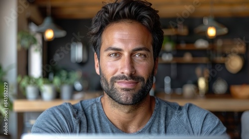 man, working, home, laptop, kitchen, modern, confident, beard, entrepreneur, business, technology, cyberspace, digital, online, professional, workspace, desk, chair, table, sharpened, productivity, success, motivated, happy, smile, casual attire, comfortable, relaxed, lifestyle, interior, design, home office, hot drink, plant, light, window, morning, day, afternoon, evening