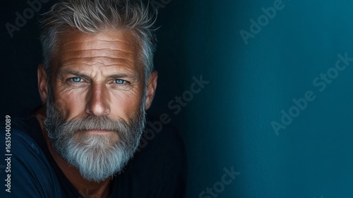 A man with a gray beard and serious expression looks intently into the camera. The close-up and lighting emphasize his rugged and thoughtful demeanor. Problems of middle age, concept.
