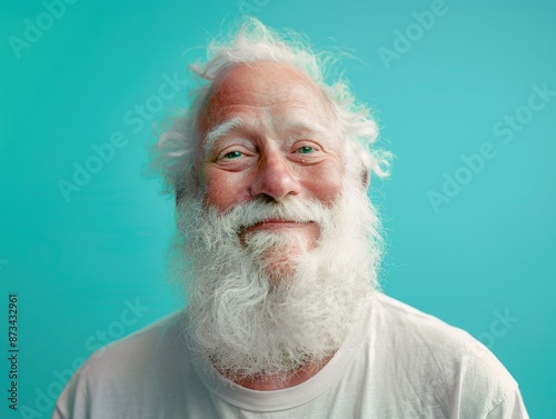 A man with a white beard and a white shirt is smiling. The image has a cheerful and lighthearted mood