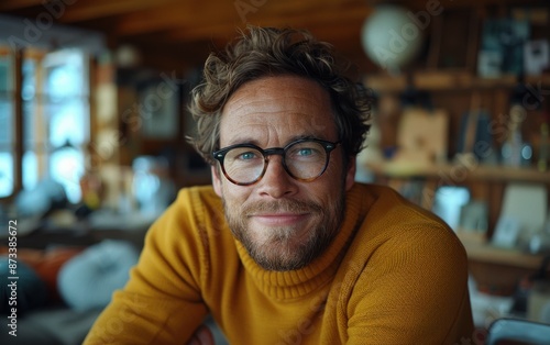 A man with curly hair and a beard is sitting in a room, wearing a yellow sweater and glasses, while looking at the camera with a smile