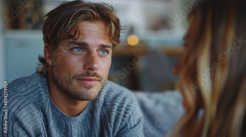 listening, conversation, man, blue eye, attention, engagement, intimacy, sharpened, understanding, discussion, communication, interpersonal, indoor, real people, closeup, eye contact, empathy, contemplation, serious, dialogue, facial expression, candid, emotional, sincerity, thoughtfulness, connection, lifestyle, sweater, facial hair, bokeh, ambience, casual attire, adulthood, interaction, modern, daytime, attentive, contemplative, eyebrow, living space