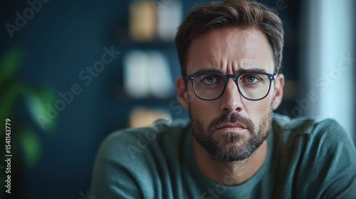 A man with glasses and a beard, wearing a green sweater, sitting in a room with a blue wall and a window.
