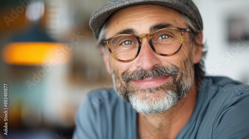 A man with glasses and a flat cap smiles warmly at the camera in an indoor setting, exuding friendliness and approachability with a hint of modern style and sophistication.