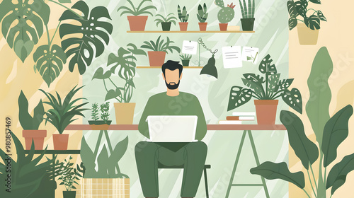 A man working with laptop remotely from home. A distant work place with many home plants. Green nature inspired home office. Indoor lifestyle