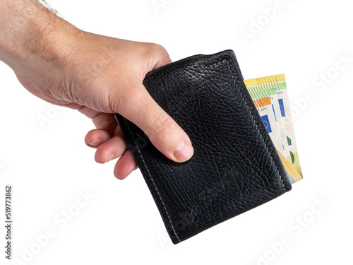 A man's hand holds a black leather wallet with euro banknotes. Isolated on white background