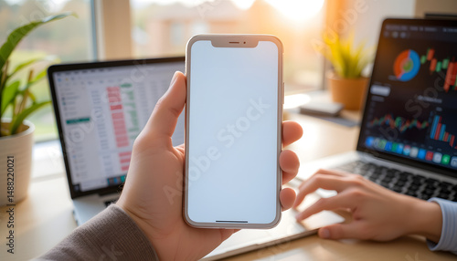 blank, white, phone, held, male, hand, blurred, laptop, graph, financial, chart, background, window, light, cheerful, vibe, morning, sunlight, technology, mobile, tablet, screen, display, hand, finger, touch, device, smartphone, touch screen, holding, communication, monitor, digital, cyberspace, business, computer, man, businessman, office, inside, building