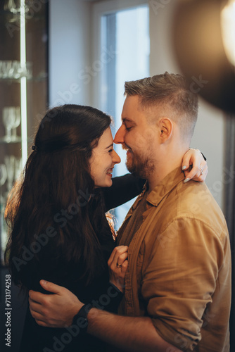 A married couple, a guy and a girl, stand opposite each other and smile. The girl hugs the guy by the neck.