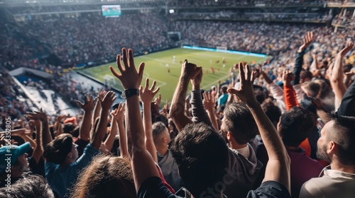 A massive crowd of enthusiastic fans cheering at a sports event, A crowded sports event with fans cheering on their favorite teams