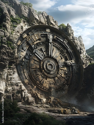 A massive gear-like structure embedded into a mountain, seemingly dormant.