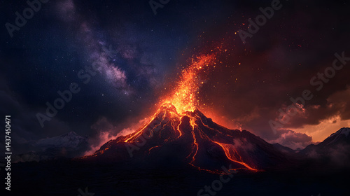 A massive volcanic eruption with red lava fountains and glowing embers lighting up the night sky with fiery brilliance.