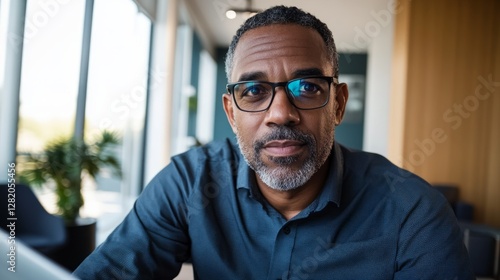 "A mature African American man with glasses, wearing a dark shirt, posing in an indoor setting."