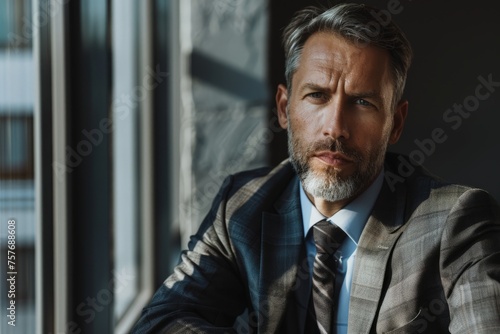 A mature middle-aged businessman in a suit and tie standing by the window, gazing outside
