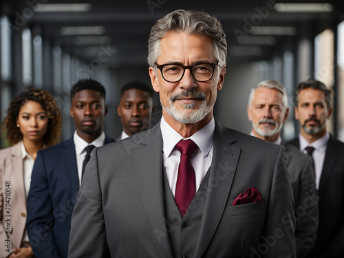 A mature senior executive in suit leading a team of managers