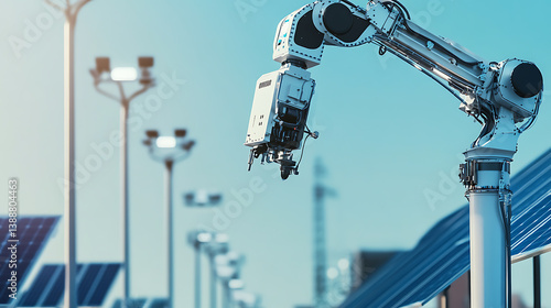 A mechanical arm in a smart city infrastructure project, surrounded by smart streetlights, solar panels