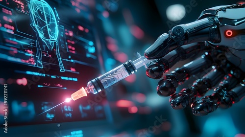 A medical robot arm with advanced AI administering a vaccine, the syringe emits light, Holographic display floating in the background, Futuristic, High-tech medical, Cool neon palette