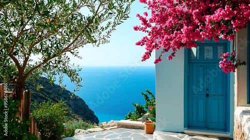 A Mediterranean view featuring a serene sea, vibrant villa, and whitewashed house under a clear blue sky with trees and flowers