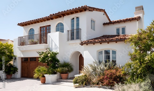 A Mediterranean-style house, white stucco walls, arched windows, terracotta roof tiles