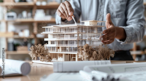 A medium close-up of an architect referencing a scale model of a building, comparing it with blueprints on the table.