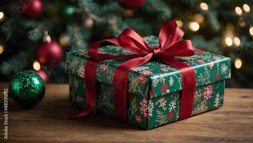 A medium sized gift box wrapped in red and green color
