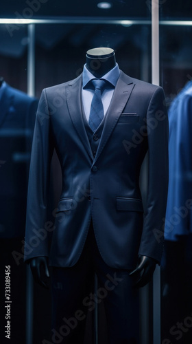 A men shirt in the form of dark blue suits on a mannequin.