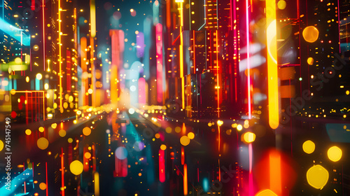 A mesmerizing abstract illustration of geometric shapes and structures bathed in colorful neon lights, casting vibrant reflections.