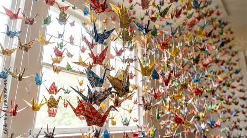A mesmerizing array of meticulously folded origami cranes in a burst of colors. The cranes, each one a small work of art, create a tapestry of shapes and hues against the backdrop of a sunlit window.
