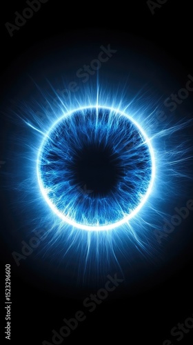 A mesmerizing blue eye with radiating light on a dark background, a symbol of focus and inner vision