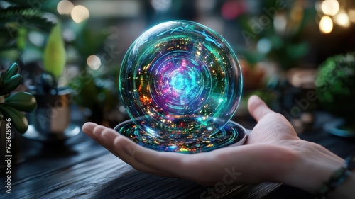 A mesmerizing crystal globe radiating colorful lights, held delicately in a hand against a lush green backdrop.