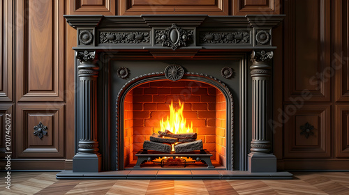 A mesmerizing fireplace, elegantly carved with ornate details, blazes with warm, inviting flames, casting a comforting glow upon the rich wooden paneling and herringbone floor. Pure coziness.