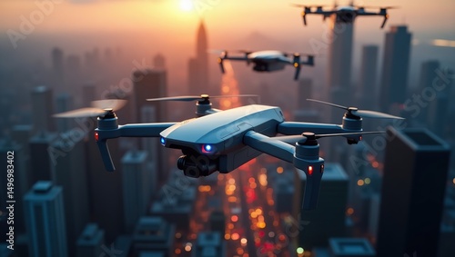 A mesmerizing flock of sleek, glowing drones flies in perfect formation above a modern cityscape at dusk, with the setting sun casting a warm glow on the skyline.