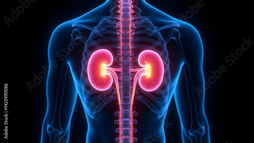 kidney, anatomy, glowing, cyan, hd, detailed, medicals, filtration, biology, illustration, digital artwork, realistic, shading, texture, light, contrast, black background, dramatic, spine, depth, realism, science, research, abstraction, urine, health, education, complexity, radiance, musculature, advanced, technology, cellular, organ, system, biochemistry, discovery, microscopic, blood flow