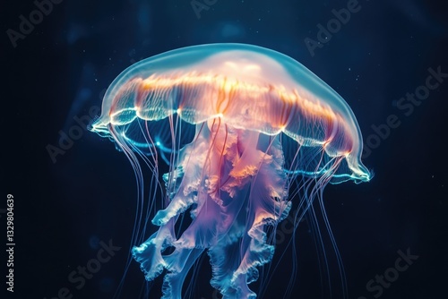 A mesmerizing jellyfish, glowing with vibrant orange and blue hues, gracefully floats in the deep ocean.