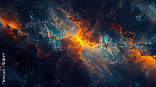 A mesmerizing nebula scene, streams of warm oranges and cool blues swirling together, sprinkled with bright starlight, vast dark space background