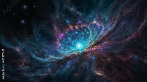 A mesmerizing view of a vibrant, swirling cosmic nebula with glowing stars, capturing the beauty and mystery of the universe