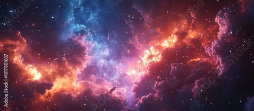 A mesmerizing view of the cosmos, with swirling clouds of gas and dust, stars, and a nebula in vibrant reds, blues, and purples.