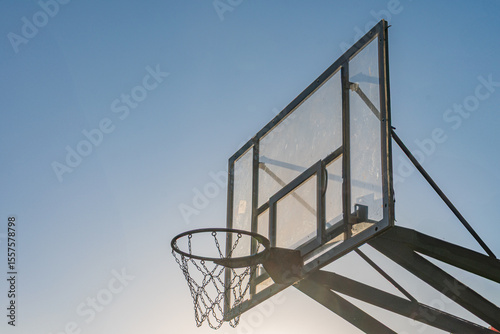 metal, hoop, basketball, backboard, square, white, net, pole, chain link, fenced, blue, sky, grey, asphalt, concrete, sunlight, lighting, morning, afternoon, shadow, perspective, surface level, art, background, texture, pattern, design, colourful, creative, modern, vibrant, geometric, shape, line, concept, dynamic, energy, motion, graphic, visual, futuristic, minimal, decorative, trendy, stylish, elegant, bright, gradient