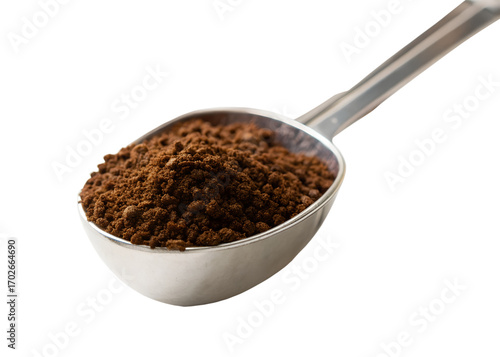 A metal spoon filled with granulated instant coffee beans overlapping together a close up view isolated on transparent background