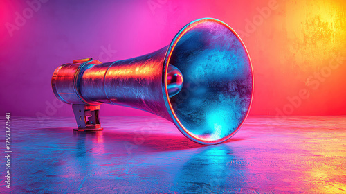 megaphone, announcement, speaker, sound, voice, communication, broadcast, message, loud, public, address, audio, technology, lighting, neon, colours, pink, blue, orange, light, metal, surface, shiny, vibrant, studio, background, design, illustration, three-dimensional, render, concept, power, promote, advertise, event, news, information, warning, alert, signal, call, attention, marketing, publicity