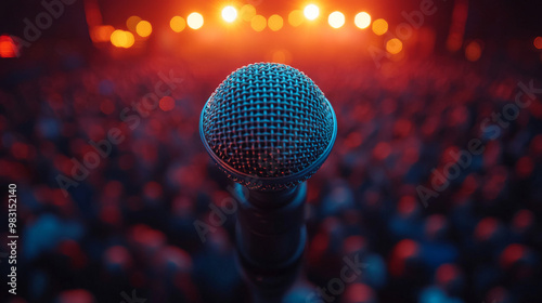 microphone, stage, crowd, performance, concert, music, event, speaker, live, entertainment, audio, sound, closeup, blurred background, spotlight, anticipation, excitement, music festival, singing, speaking, recording