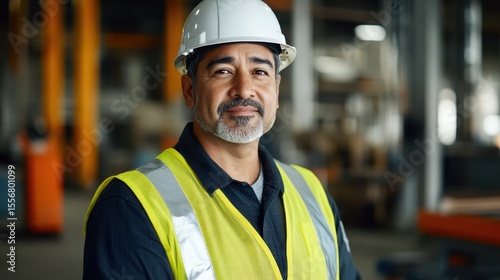 portrait, engineer, middle, aged, hispanic, male, safety, gear, construction, profession, work, confident, warehouse, industrial, hard hat, yellow, vest, smiling, job, teamwork, adult, mature, man, standing, equipment, background, precaution, proud, workplace, labor, expert, sharpened, skill, attire, environment, professional, life events, contractor, industry, men at work, leadership, dedication, responsibility