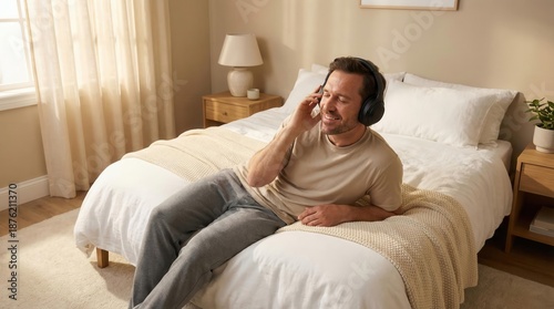 man, hispanic, dark, hair, bed, earphones, music, smiling, cosy, bedchamber, interior, furniture, light, curtain, relaxation, comfort, lifestyle, home, casual attire, happy, sitting, room, decor, soft, bedding, wood, nightstand, lamp, modern, design, peaceful, atmosphere, enjoyment, leisure, personal, space, indoor, daylight, warm, colours, neutral, vibrant, sound, technology, entertainment, mood, joy