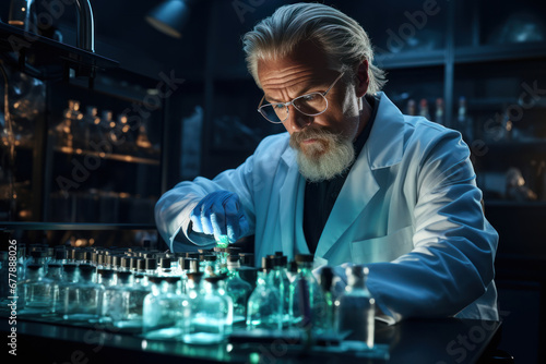 A middle-aged man in a lab coat, meticulously conducting scientific experiments in a laboratory. Concept of research and innovation. Generative Ai.