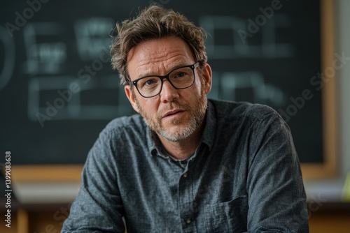 man, middle-aged, goggles, blackboard, diagram, thoughtful, serious, prof, teacher, lecturer, education, learning, classroom, school, university, college, intellectual, pensive, contemplative, cognition, wisdom, expertise, adult, male, portrait, person, face, expression, casual attire, shirt, grey shirt, background, blackboard, lesson, teaching, study, student, academic, research