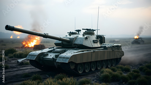 tank, war, battle, combat, battlefield, explosion, fire, smoke, destruction, weapon, vehicle, armored vehicle, army, military, soldier, combatant, power, strength, force, danger, death, loss, conflict, violence, tragedy, history, politic, geopolitics, strategy, tactic, technology, engineering, design, industry, manufacturing, production, logistic, support, team, crew, operator, driver, artilleryman, commander, armed